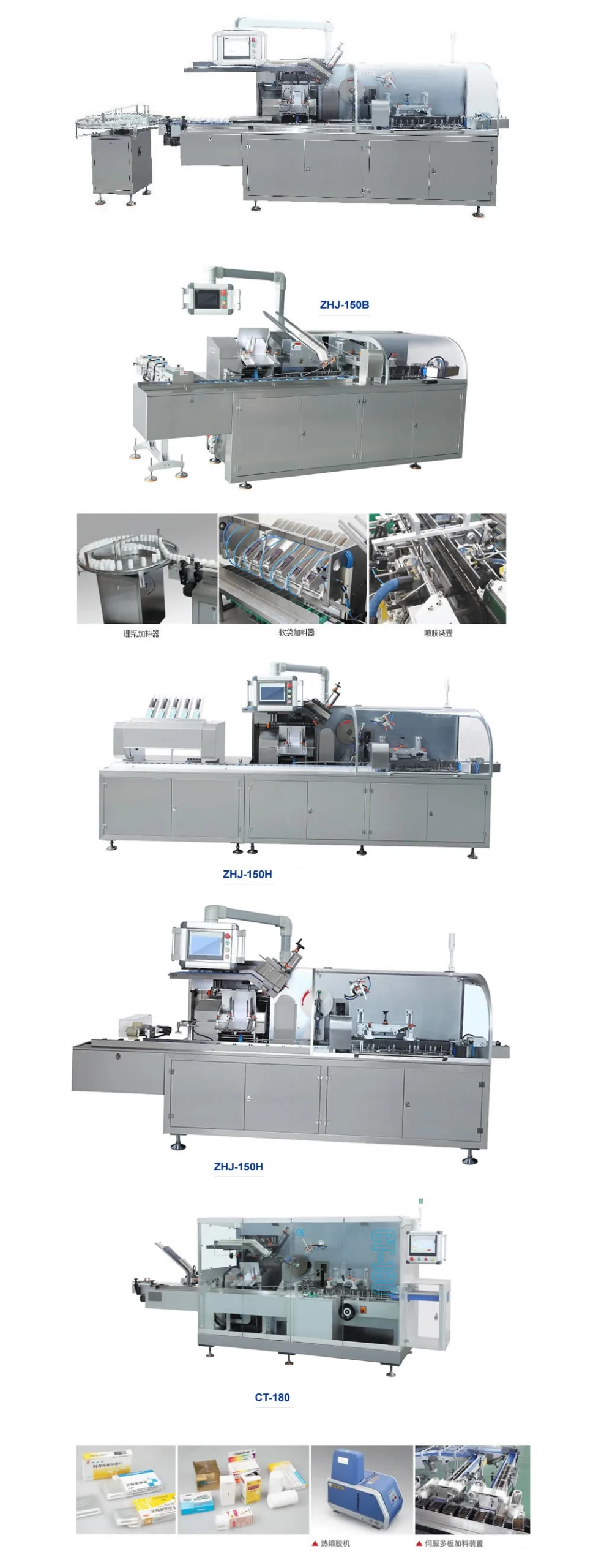 ZHJ-150/CT-180 automatic cartoning machine is suitable for intermittent cartoning of medicine plates, hoses, ampoules and similar items. The maximum speed can reach 130 boxes/min. It can adapt to a wide range of box sizes and change varieties. Easy to adjust. It can automatically complete the folding of the manual, the opening of the carton, the boxing of the plate, the printing of the batch number, and the sealing. Adopt frequency conversion speed regulation, man-machine interface PLC control. Photoelectricity monitors the movement of each part, and if there is an abnormality during operation, it can automatically stop and display the reason for timely troubleshooting. It can be used alone or connected with blister packaging machines and other equipment to form a production line. Original main drive rear design, easy to maintain power.