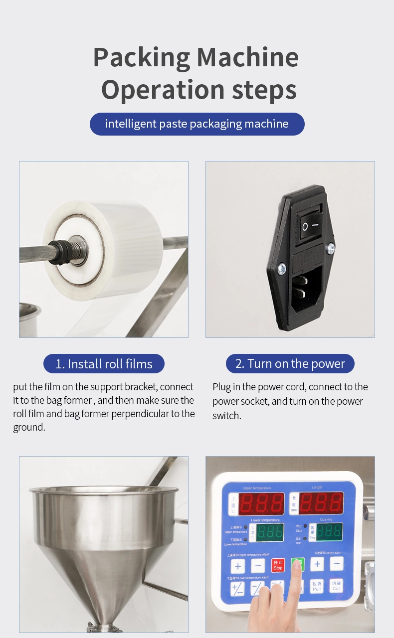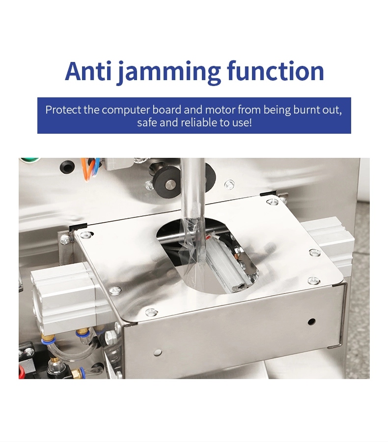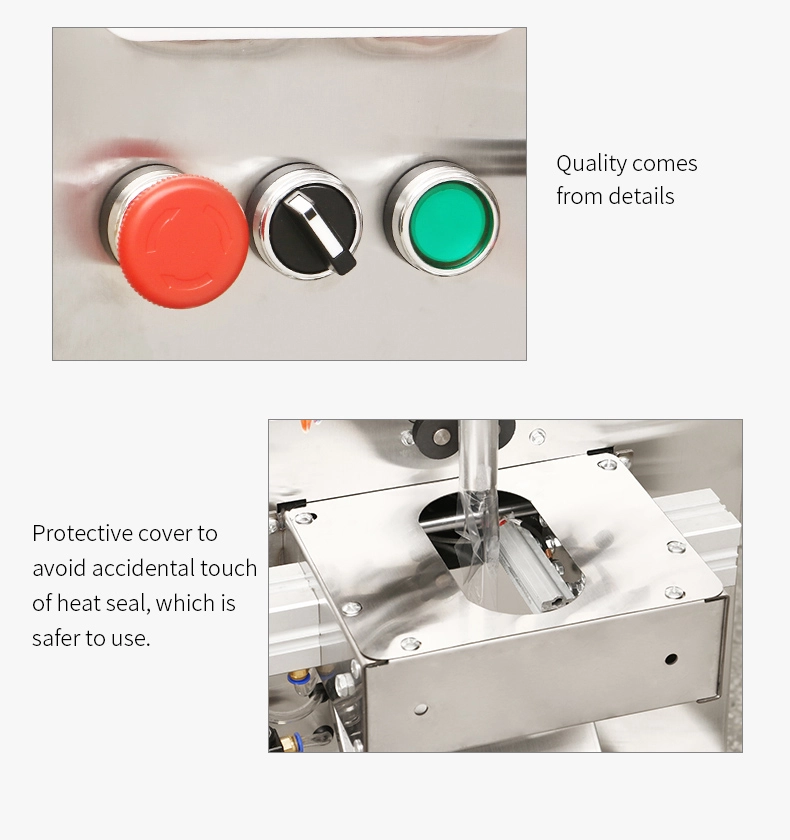 The machine is fully stainless steel material which comply to food safety grade and rust-proof, equip reliable performance electric & mechanism compoment.High packing capacity and speed, high efficient and lower your labour cost. The machine is with a series function of automatic measuring, filling, bag forming and making, sealing and cutting process. The finished packaged pouch is reliable and elegant.