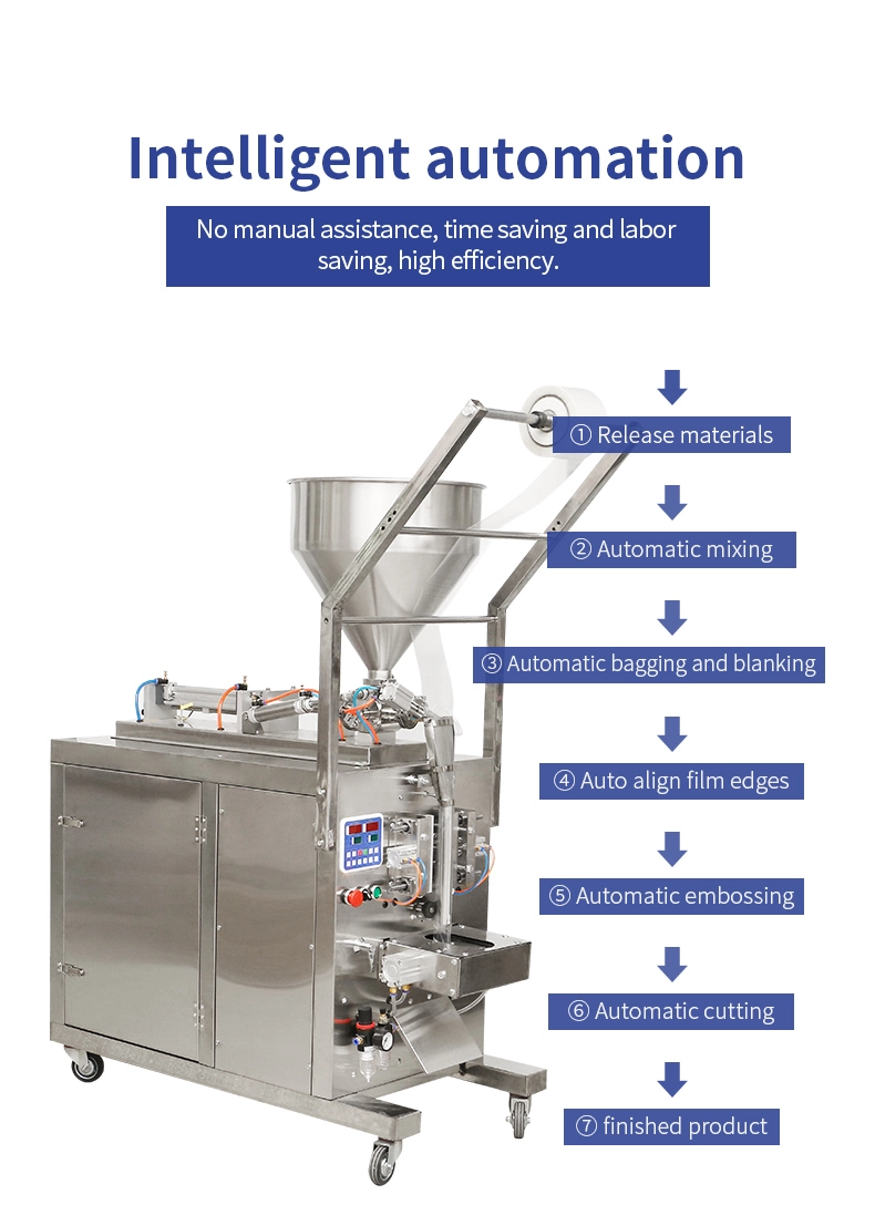 The machine is suit for automatic filling and packing liquid/paste/sauce/cream item, such as honey, hair shampoo, tomato paste, salad dressing, jam ect. The machine adopt the pneumatic pump dosing unit which have the machine advantage of suit for viscous liquid item with high efficient and reliable performance. The most important is the machine equip with small horizontal ribbon blender mixing machine, this will make the machine much suit for seasoning paste/sauce, such as chilli paste, for the mixing machine will have the paste evenly packaged with less deposite.