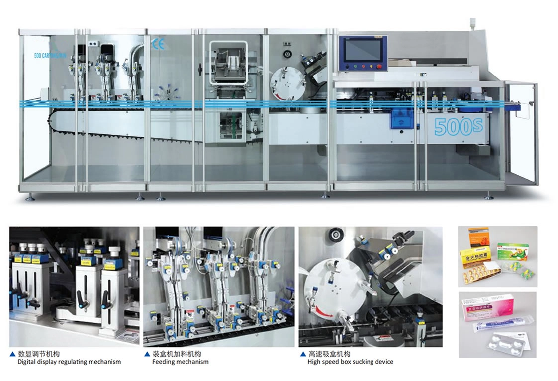 This product is suitable for high-speed packaging of objects such as medicine plates and bottles, with a maximum speed of 500 boxes per minute. A mechatronics integrated product developed using advanced technology consists of feeding, folding instructions, unfolding medicine boxes, inserting instructions, marking batch numbers in paper boxes, sealing medicine boxes, and outputting finished products. It adopts integrated automatic control of machinery, electricity, light, and gas to achieve automated production of pharmaceutical packaging. Advanced detection methods are used in all operating links, and unqualified products are automatically removed to ensure a 100% qualified rate of finished products, Controlling human errors to the minimum effectively prevents quality degradation caused by contamination during the packaging process of drugs, ensures that the production process of drug packaging fully complies with GMP requirements, and significantly reduces production costs and labor intensity. The fully servo model adopts 12 sets of power servo and 6 sets of automatic adjustment servo, achieving high stable synchronous operation and convenient variety replacement with one click adjustment of sizeMain technical parameters: