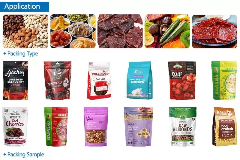 The Automatic Beef Jerky Biltong Stand Up Pouch Zipper Bag Doypack Packing Machine is suitable for a wide range of products, including beef jerky, biltong, dried fruits, nuts, snack mixes, granola, protein bars, pet treats, coffee, tea, and powdered seasonings. Its versatile design makes it ideal for various snack and food products that require secure, stand-up packaging.