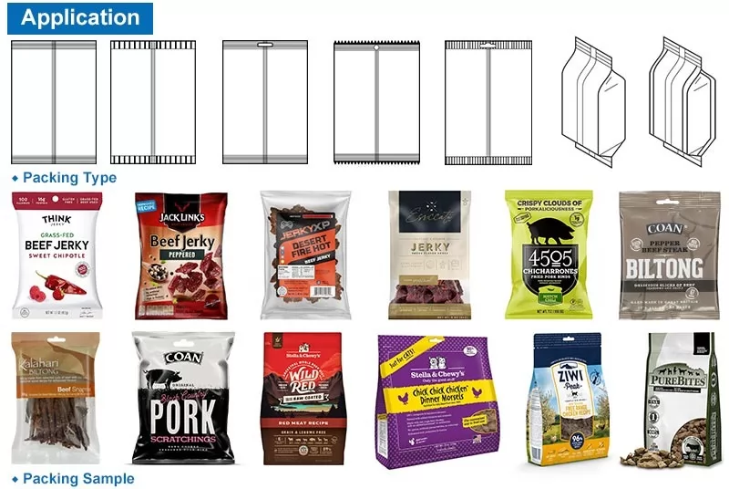 Automatic Beef Jerky Packing Machine With Bowl Inclined Bucket Conveyor (LD-420W/ 520W/ 720W/ 900W/ 1050W/ 1200W), It suitable for packaging in food, agriculture, pharmaceutical, cosmetics, chemical and other industries. such as beef jerky, biltong, chicken nuggets, snack foods, frozen foods, vegetables, fruits, candies, chemicals and other particles.