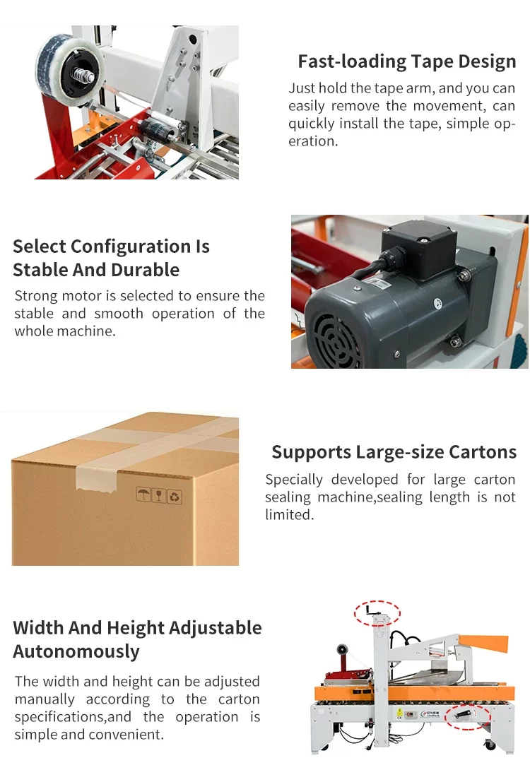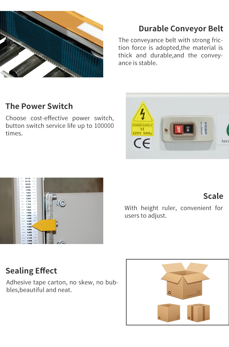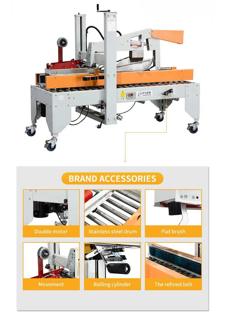 The automatic folding and sealing machine can automatically fold the upper cover and automatically stick the tape on the top and bottom without manual operation; the carton is sealed with instant tape, the sealing effect is smooth and beautiful, and the sealing is firm. It can be operated by a single machine or equipped with an automated packaging line. Widely used in food, medicine, beverage, tobacco, daily chemical, automobile, cable, electronics, and other industries.