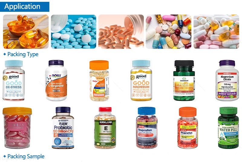 This counting filling line is suitable for fully automatic bottle unscrambling, counting, filling, sealing, capping, labeling, and other workflows (optional boxing) of various granular products. Such as tablets pills capsules chewing gum soft gel, etc.