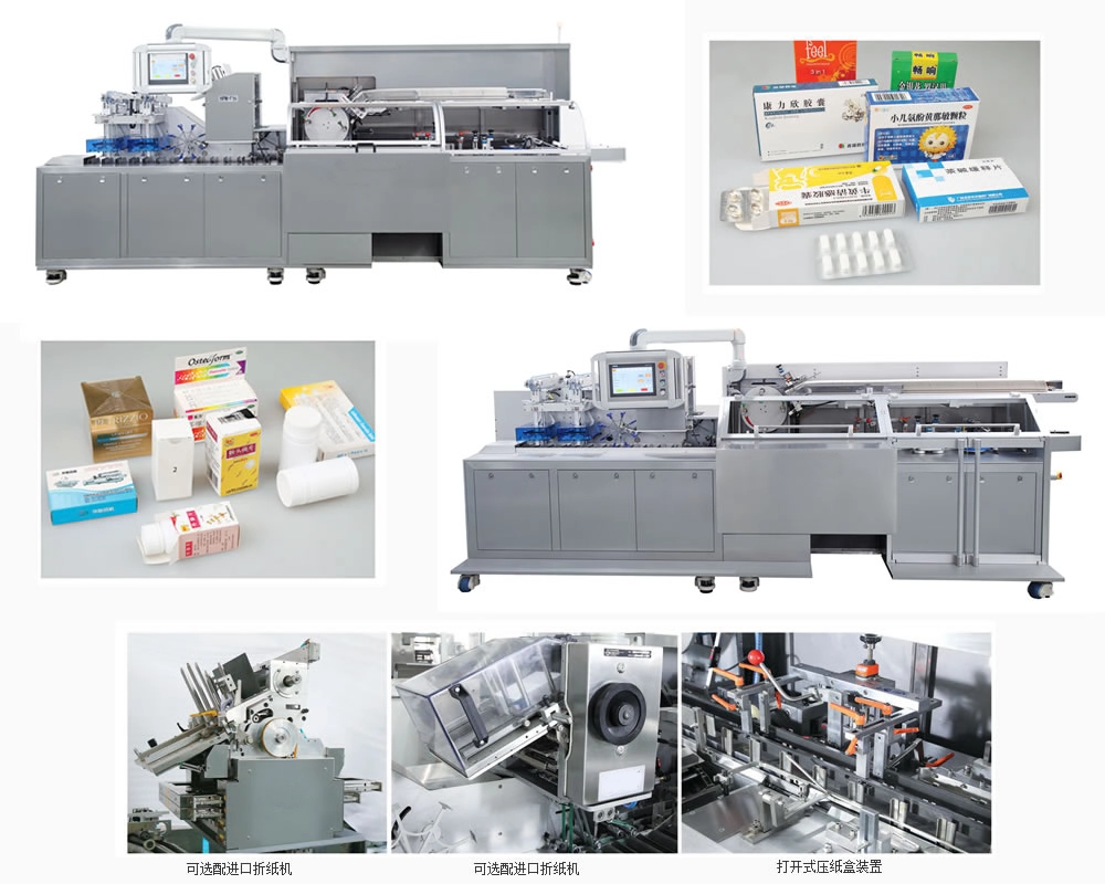 Automatic High Speed Cartoning Machine is intelligent, continuous automatic cartoning equipment, suitable for packing blisters, tubes, ampoules and other related objects into boxes. The highest speed can reach up to 370 cartons/min. It has advantages of high packing efficiency and good quality, and is hi-tech Product with structure of mechanical-electrical integration. This machine can fold leaflets, open cartons, insert blisters into cartons, emboss batch number and then close or seal automatically. It adopts frequency invertor to adjust speed, human machine interface to operate, PLC to control, and photoelectric detector to supervise and control each station so that once there is anything wrong with the machine, it will stop and display the troubles automatically so as to solve them in time. This machine can be used separately, or be linked with other machine to form a Production line. Note: this machine can also equip hot melt glue device to do hot melt glue sealing for box.
