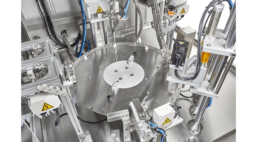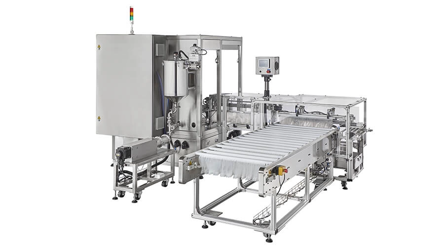 The nozzle bag liquid automatic filling and locking machine is used for formed nozzle bags. The nozzle bag filling machine is specially designed to be applied to the top or bevel nozzle to fill the liquid into the bag through the nozzle. It is suitable for the food and chemical industry.