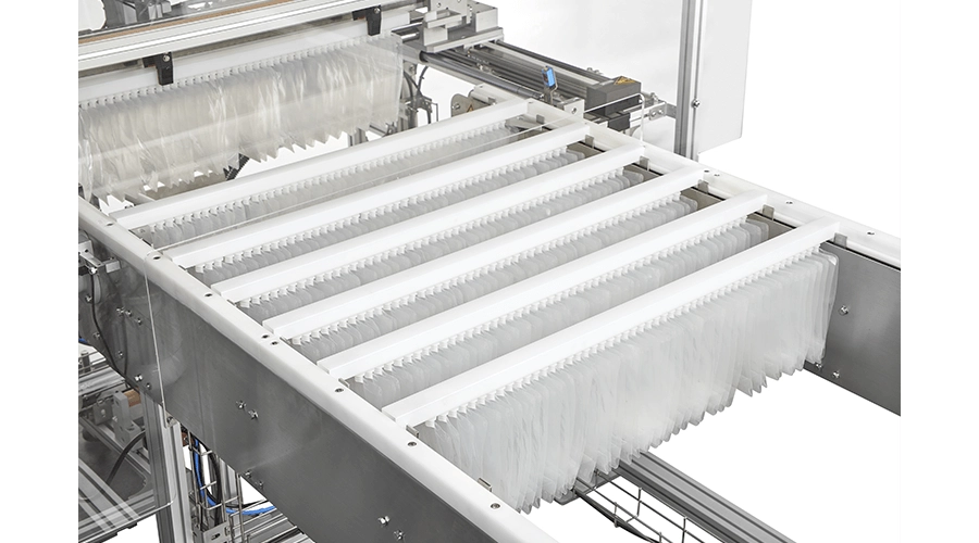 The multi-track bag-setting track automatically transfers the bags to the bag-inputting mechanism, and at the same time, pushes the boom into the collecting trough.