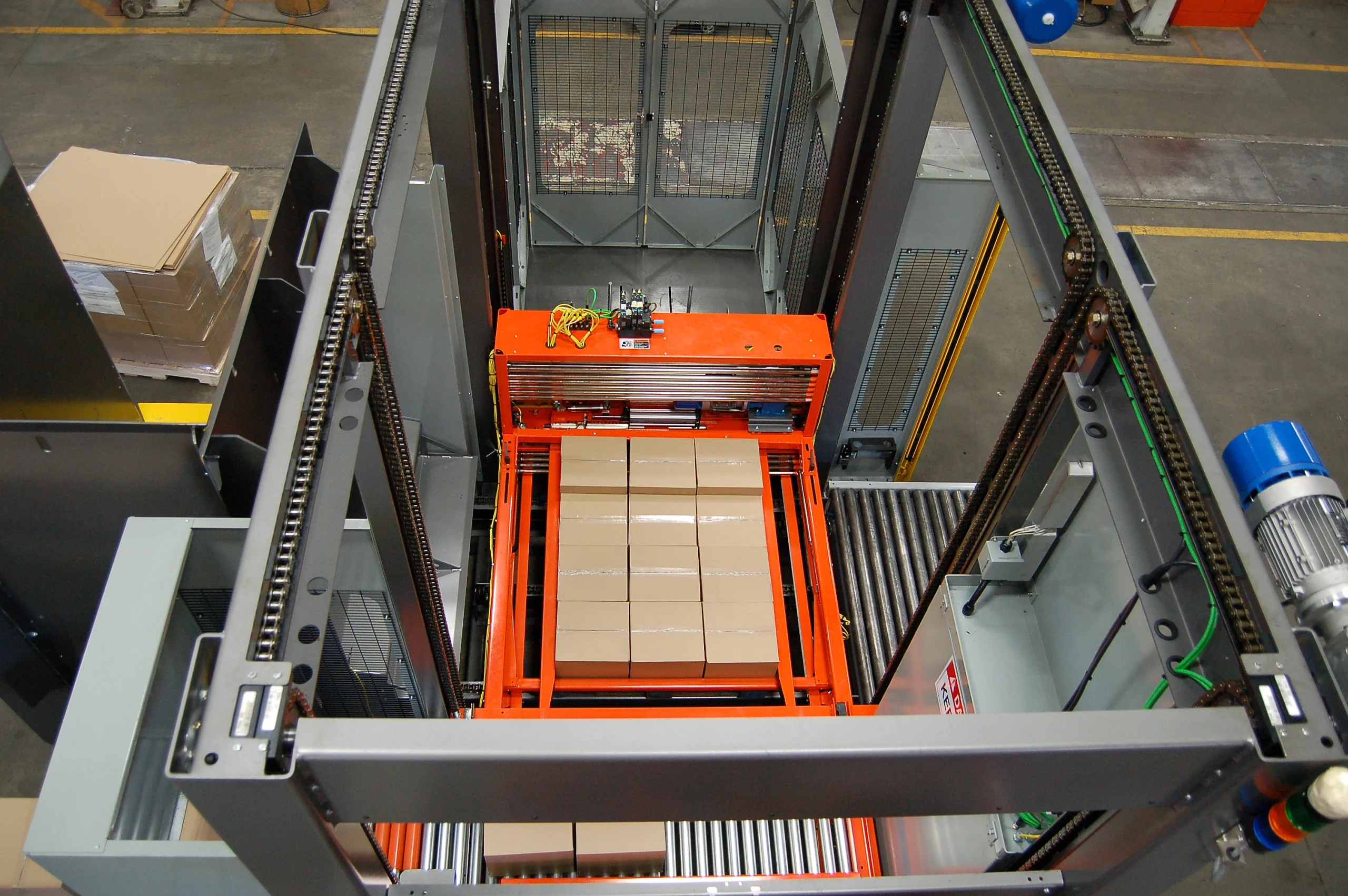 Floor level palletizer machines have an infeed entry level of approximately 36″ and a typical pallet discharge conveyor elevation of 18″. Floor level palletizers, when compared to high level palletizers, are generally lower in cost and provide easier access to the entire machine.