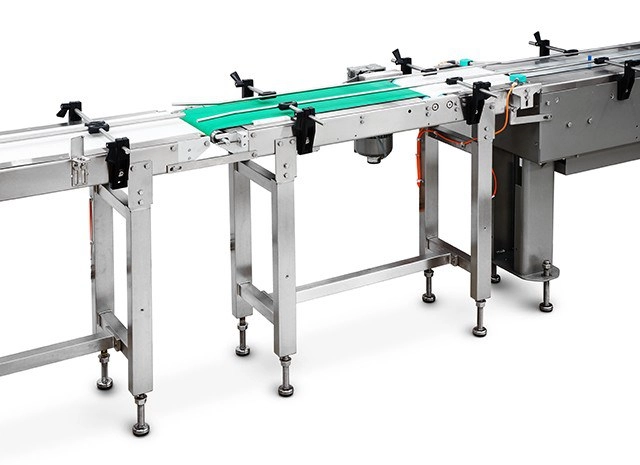 - Infeed conveyor with one belt and two pushers specifically designed for peppers.
