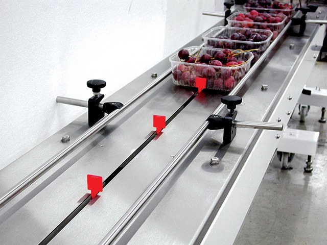 - Infeed conveyor with one belt and two pushers specifically designed for peppers.