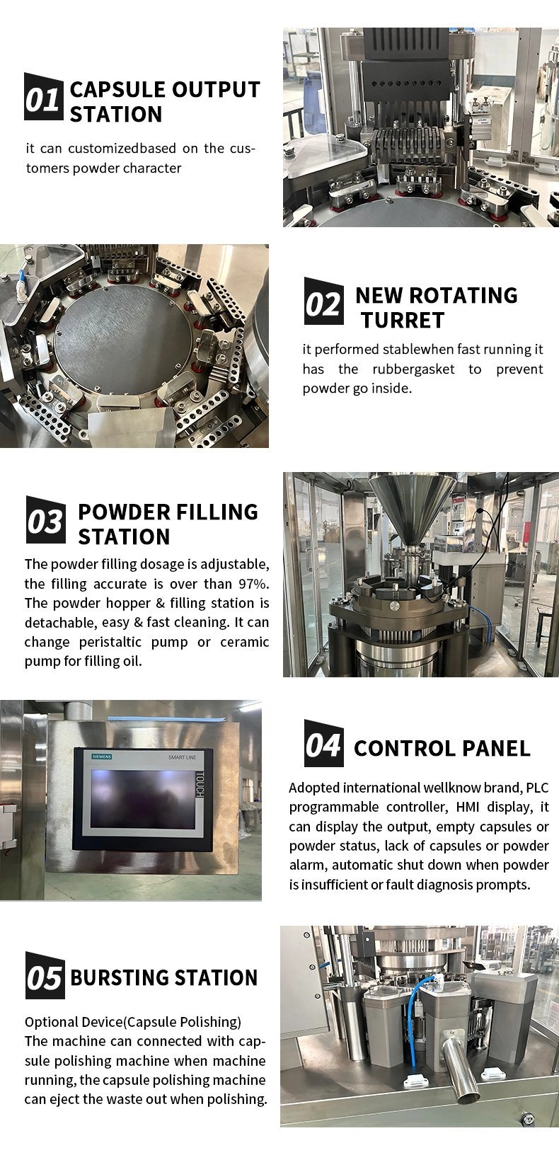 GL series automatic capsule filling machine is a new type of product specially improved by our company according to the market experience. The appearance of the whole machine adopts curved surface design, the device has smooth flow line and beautiful appearance. The device adopts PLC programming, man-machine interface operation and touch screen display. Automatic alarm display for operation failure or lack of material, automatic shutdown, automatic elimination of alarm after troubleshooting. The machine also has functions such as password input, parameter setting, print data, and clearing. All the key parts of the machine, such as drive shaft, cam, bearing, etc., are made of imported materials and reliable in quality. They are the ideal equipment for filling capsule medicines and fully comply with GMP requirements.