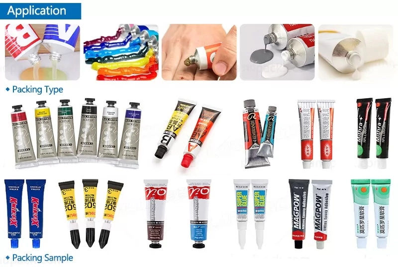 This aluminum tube filling machine can be widely used in the Food, Cosmetics, Pharmaceutical, and Chemical industries, applicable for producing paste, adhesives, AB glue, epoxy glue, skin creams, hair dyes, shoe polish, toothpaste, RTV silicone, etc.